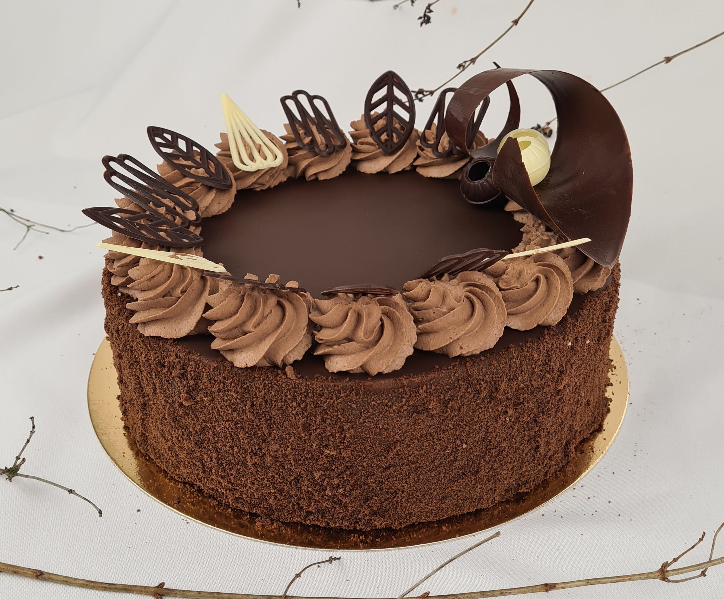 Smetanový dort s pařížskou šlehačkou, banánem a sacher korpusem.